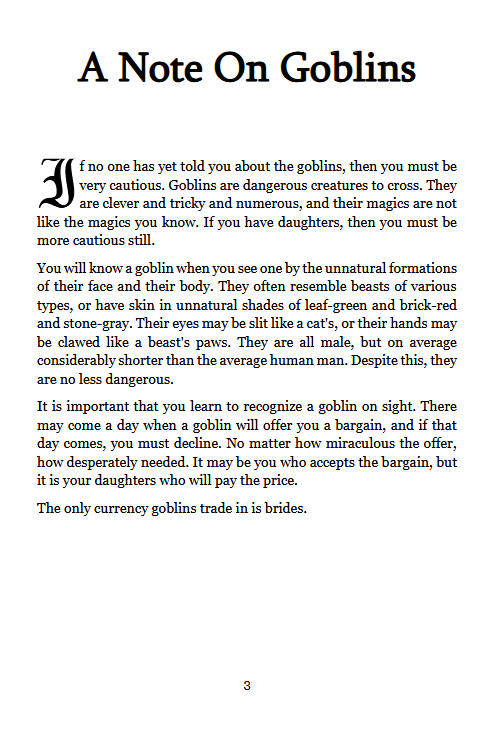 If no one has yet told you about the goblins, then you must be very cautious. Goblins are dangerous creatures to cross. They are clever and tricky and numerous, and their magics are not like the magics you know. If you have daughters, then you must be more cautious still.