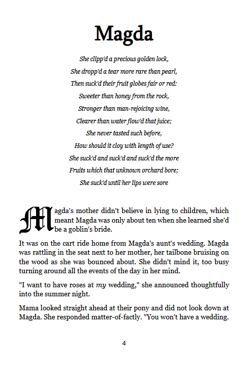It is important that you learn to recognize a goblin on sight. There may come a day when a goblin will offer you a bargain, and if that day comes, you must decline. No matter how miraculous the offer, how desperately needed. It may be you who accepts the bargain, but it is your daughters who will pay the price.